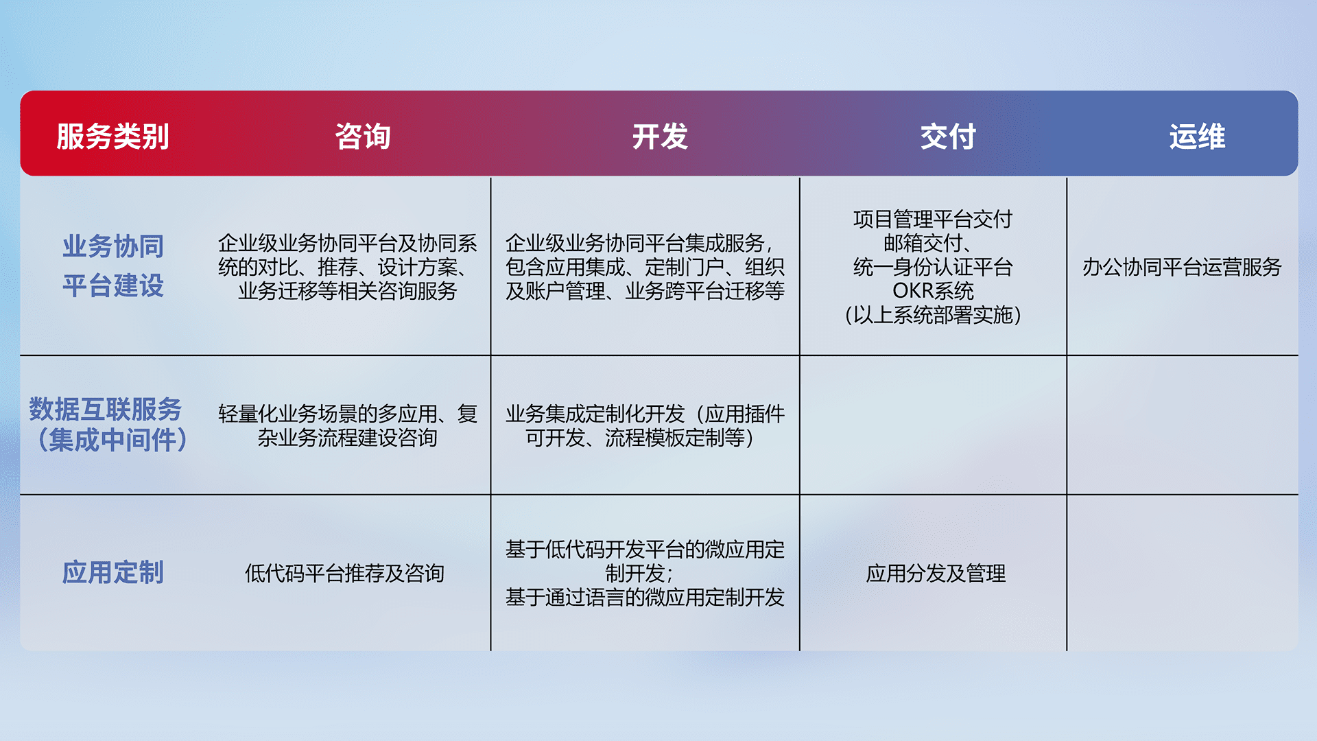 针对钉钉、、企微、、、IDaas等平台级产品提供产品的规划、、、方案、、、交付、、、、定制化开发等服务,,,实现如统一协同办公、、、、智能客户服务、、、、混合会议管理、、、智能数据查询、、、等业务场景,,,,实现数字化转型。。。