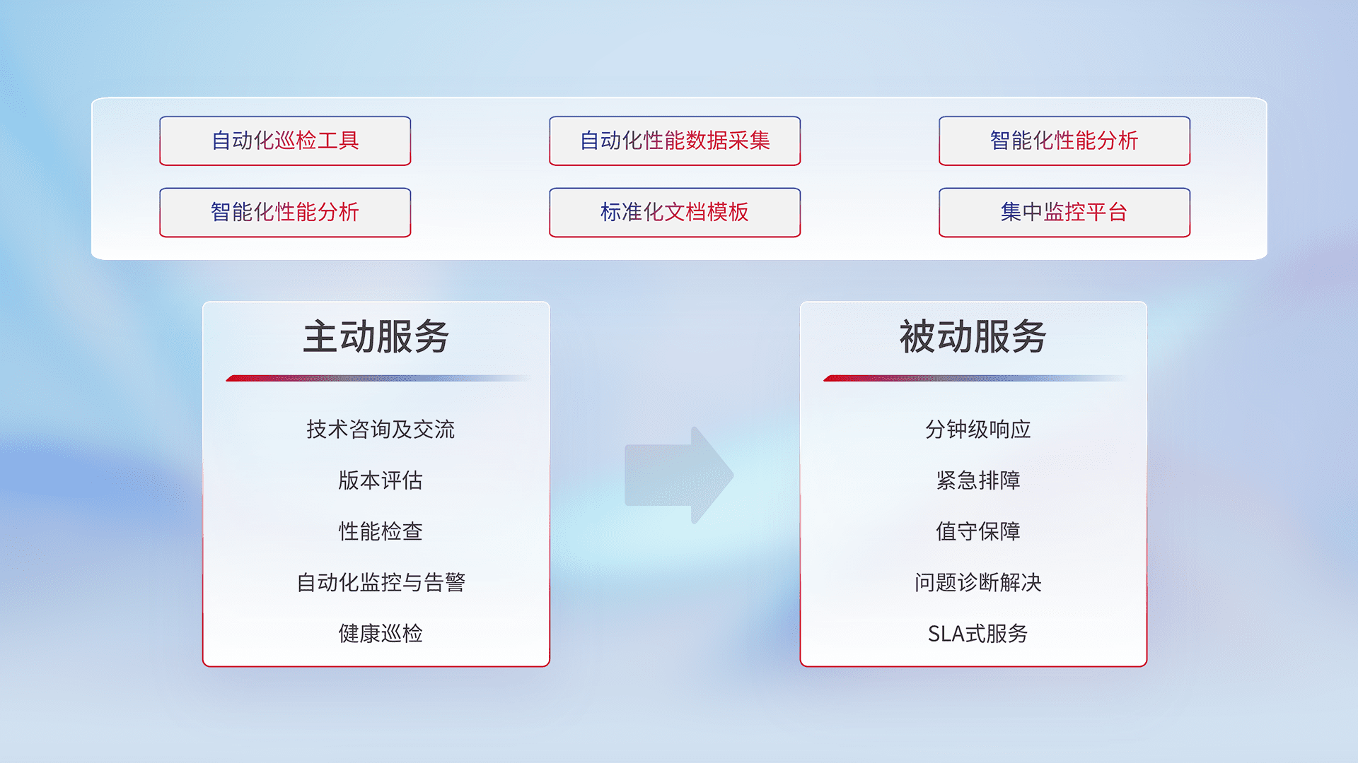 智能化工具和标准化文档,,,保障服务质量,,提供主动服务(包含技术咨询、、、版本评估、、、、性能检查、、、自动化监控与告警、、、、健康巡检)和被动服务包含(分钟级响应、、紧急排障、、、值守保障、、、问题诊断解决、、SLA服务)。。